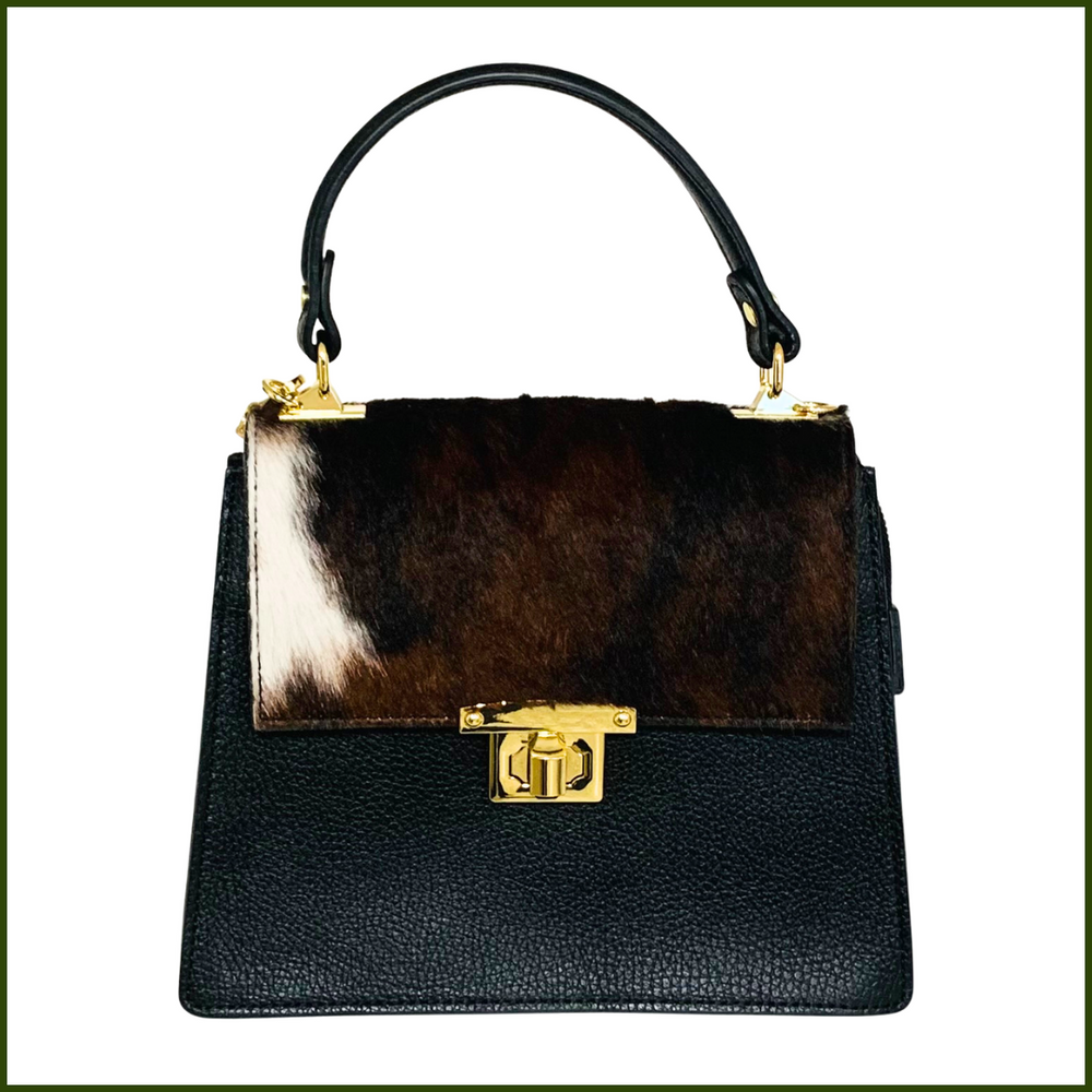 Add Luxury Italian Leather Black Multi Fur Handbag Turn Lock Closure to the cart
