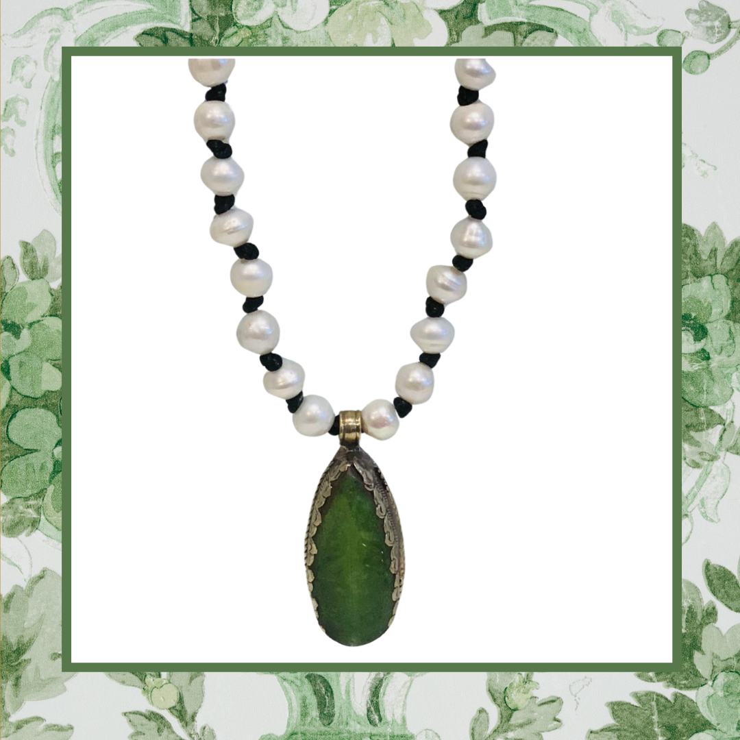 Add Green Agate Stone Pendant Pearl Silk Knotted Necklace to the cart